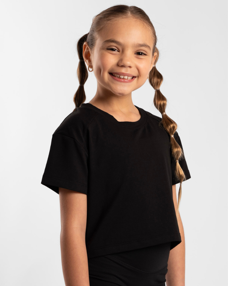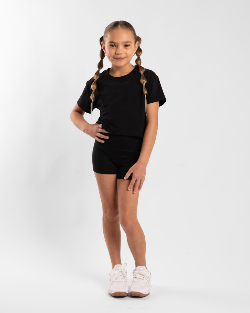 Introducing our Kids Cropped Tee in Onyx. Same great fabric and fit as our Women’s Core Collection. Tailored to Kids sizes 6-14. Perfect for Dance Schools, Gymnastics, Athletics & Cheer Squads!